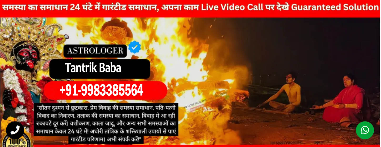 यदि आप किसी भी समस्या से जूझ रहे हैं, चाहे वह प्रेम जीवन, शादी में बाधा, पति-पत्नी के बीच कलह, या परिवार में किसी प्रकार की परेशानी हो – अब समय है असली अघोरी तांत्रिक बाबा से संपर्क करने का। हमारे अनुभवी तांत्रिक बाबा जी की शक्तिशाली और प्रभावी तांत्रिक विद्या से हर समस्या का गारंटीड समाधान मिलेगा। घर बैठे अपनी समस्या का हल पाएं और अपने जीवन में सुख-शांति को बहाल करें। बाबा जी का वादा है कि आपकी समस्या का समाधान 24 घंटे में होगा, और आप पूरे कार्य को Live Video Call के माध्यम से देख सकते हैं। असली तांत्रिक बाबा जी की विधि से आपके जीवन में शांति और सुख की गारंटी है।